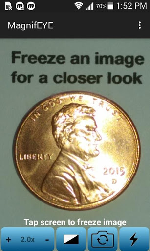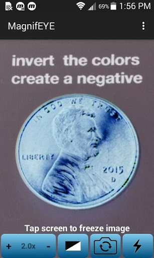 Ứng dụng đơn giản sử dụng máy ảnh của bạn để phóng to các đối tượng lên đến 10 lần.Bạn có thể chuyển sang camera trước và sử dụng như một tấm gương với các thanh ánh sáng cho ánh sáng mờ.Một cú chạm đơn giản trên màn hình đóng băng hình ảnh để xem kỹ hơn và nút lưu cho phép bạn gửi nó đến thư mục ảnh của mình.Một nút để đảo ngược màu sắc sẽ tạo ra một hình ảnh âm và tăng độ tương phản trong một số điều kiện.