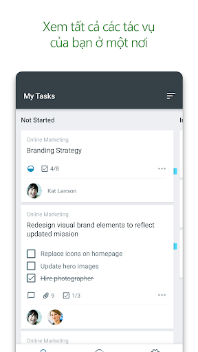 Chế độ xem Tác vụ của Tôi mang tới danh sách toàn diện về tất các tác vụ và trạng thái của chúng trong mọi kế hoạch. Khi phối hợp trong một kế hoạch, các thành viên nhóm luôn biết ai đang làm gì.