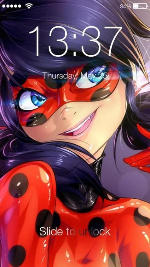 Ladybug wears a red skintight bodysuit covered in black spots and with a black collar. On her face there is a red mask with five black spots that are in a symmetrical design, and the waterlines of her eyes are colored black. Her earrings are red with five black spots in a quincunx pattern and the bands holding her hair back become red ribbons, resembling a ladybug's wings when it's flying. So, if you are a fan of a miraculous Ladybug then our new Lock Screen is just for you! This cool