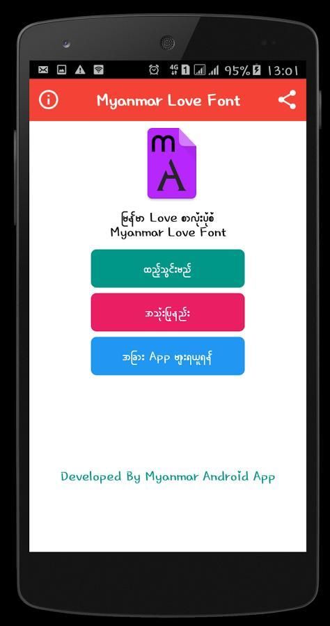 "Myanmar Love Font" Root မလိုထည့္သြင္း ျမန္မာစာလုံးအလွတစ္ခုျဖစ္ပါသည္။