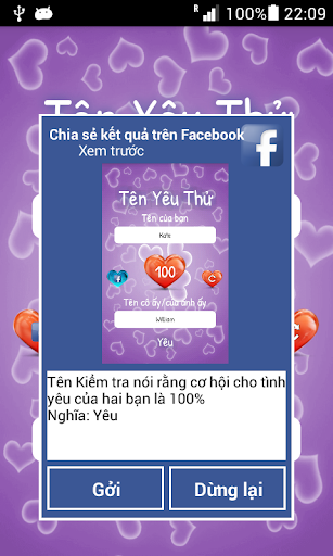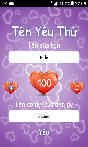 Nhập tên của bạn và tên của người bạn yêu và bài kiểm tra sẽ tính tỷ lệ phần trăm và kiểm tra tình yêu của bạn bằng cách so sánh tên của bạn và tính toán bài kiểm tra tình yêu cặp đôi của bạn. (*1)