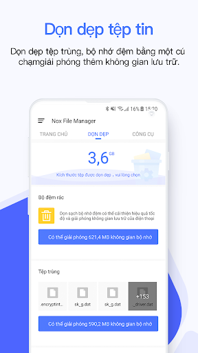 Nox File Manager phân tích tình trạng sử dụng bộ nhớ của thiết bị & phát hiện những tệp APK lớn, tệp trùng & hỗ trợ người dùng xóa bỏ những tệp đó để giải phóng thêm bộ nhớ.