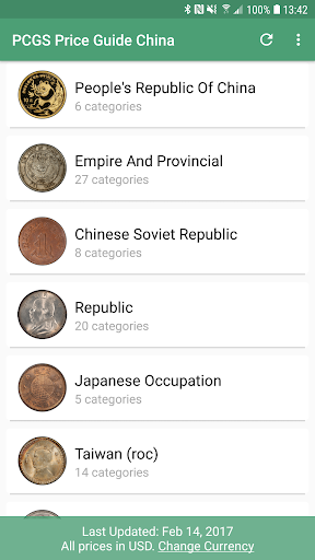 Dịch vụ chấm điểm Coin chuyên nghiệp mang đến sự chuyên môn về giá của nó cho lĩnh vực nổi tiếng của Trung Quốc với ứng dụng toàn diện này cung cấp các giá trị bán lẻ cho các đồng tiền Trung Quốc từ giữa thế kỷ 19 đến nay.