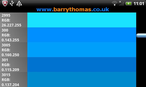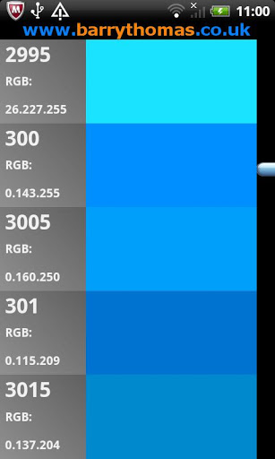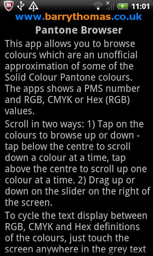 This utility app allows you to browse colours which approximate to Pantone solid colours and see their nearest PMS number and RGB, CMYK or Hex values.Scroll in two ways: 1 Tap on the screen to browse up or down tap below the centre to scroll down a colour at a time, tap above the centre to scroll up one colour at a time. 2 Drag up or down on the slider on the right of the screen.Take a screenshot of the colours on screen via the menu. The resulting file is saved on the root level of your SDcard, with the name quot;ColourXXXX.pngquot;, where XXXX is the number from the top row on the display.This app is not produced by Pantone and has no connection with the company of that name. The app is provided asis, do not rely on it in any way. May contain small parts. May contain nuts Slippery when wet. YMMV.