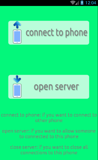 Connect to phone: if you want to connect (get screen and invoke touches) to other phone, which this app also installed in it and make sure the server is opened in the other side.