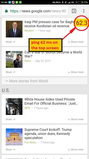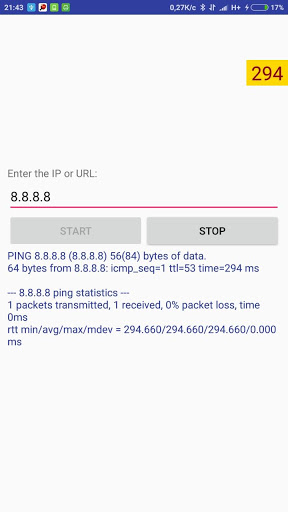 This application show PING (delay IP or site) on top of the screen and any application. The window can be moved with your finger.