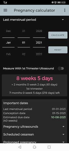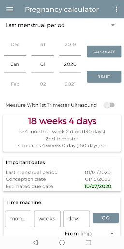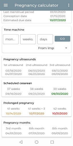 • Ngày đến hạn, tuần trôi qua, các tuần và ngày còn lạiNgày cho tam cá nguyệt thứ hai, ngày bắt đầu cho ba tháng ba.• Ngày thụ thai.