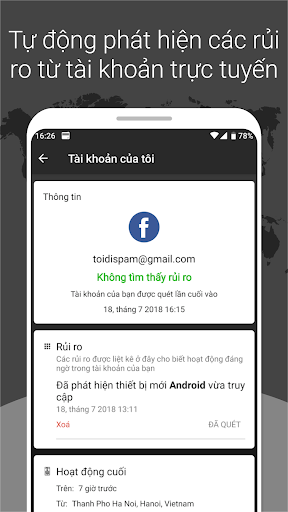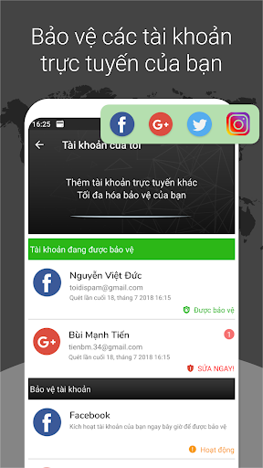 Bảo vệ đồng thời các tài khoản Facebook, Gmail, Instagram, Twitter. Phát hiện và ngăn chặn sự xâm nhập trái phép, không phải là bạn. Liệt kê hoạt động đăng nhập giúp phát hiện truy cập khả nghi và đưa ra các giải pháp để bảo vệ tài khoản trực tuyến của bạn.