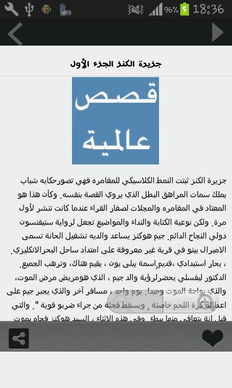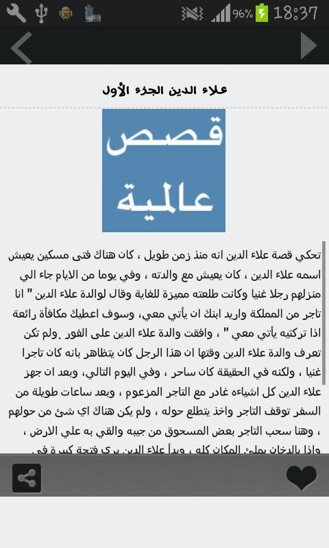 The application of universal tales and stories contains many of the world famous novels and true stories and other fictional works without Internet access, perfect stories for adults and children and is the stories and through suitable for all ages and you can read it anywhere. Currently app contains the story of Aladdin and Snow White and Pinocchio and Alice in Wonderland, and Jack in the land of the Giants and the story of Treasure Island and other stories will spend more than a fun time to read. The application is designed to add a number of stories between each vessel and the other will be added to the story of Les Miserables and the story of Heidi and perhaps stories of the prophets and stories of a long story of Harry Potter and local stories by country and Indian polish such as stories and Arab art, our goal from the application first publication of the culture of reading and see and also add Joe from doing so during the entertainment, and also examine the desire of the Arab Aljhmur more upscale in order to increase the content of our giving.