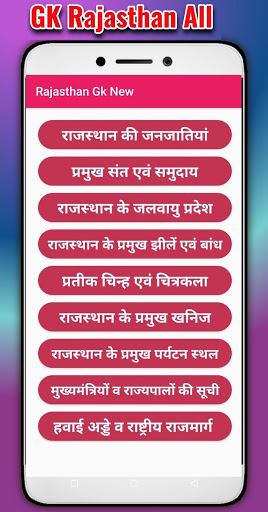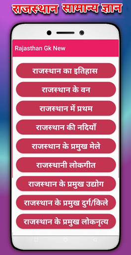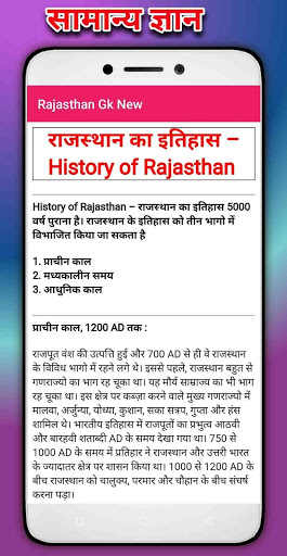 Rajasthan GK - Thông tin kiến thức chung của Rajasthan có sẵn trong ứng dụng này. Kiến thức chung của Rajasthan) đã được đưa ra ở đây trong ngôn ngữ tiếng Hin-ddi cho các kỳ thi chính phủ và phi chính phủ khác nhau ở bang Rajasthan, đã được đưa ra ở đây trong ngôn ngữ tiếng Hindi, điều này cực kỳ quan trọng đối với việc chuẩn bị các kỳ thi cạnh tranh quan trọng.