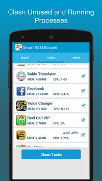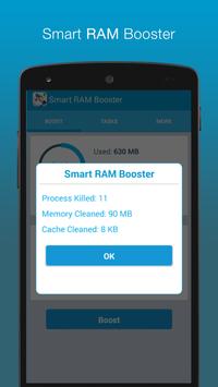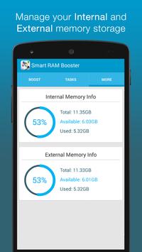 You can boost your RAM with single touch. Touch boost button and clear running process. In Tasks tab you can swipe to clean individual process from ram memory. In more tab you also know about your internal and external memory status.