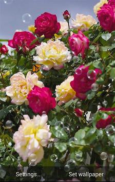 Roses Garden Wallpaper is a vivid picture of roses garden wallpaper with many raindrop on screen and some butterflies flying across and many bubbles which broken when you touch it .