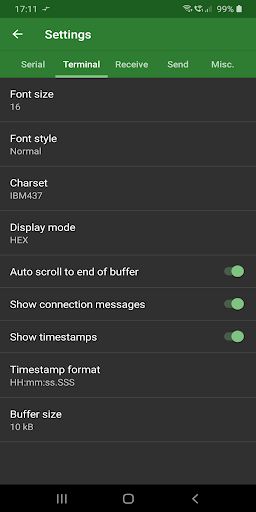 'Terminal USB nối tiếp' là một ứng dụng thiết bị đầu cuối / bảng điều khiển hướng theo dòng cho vi điều khiển, Arduinos và các thiết bị khác có giao diện nối tiếp / UART được kết nối với bộ chuyển đổi USB sang nối tiếp với thiết bị Android của bạn.