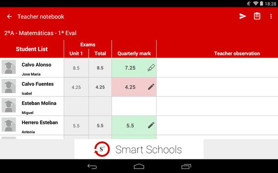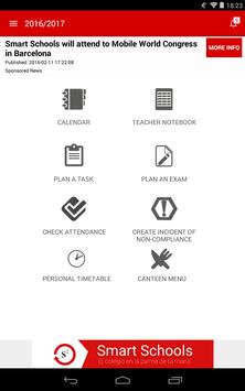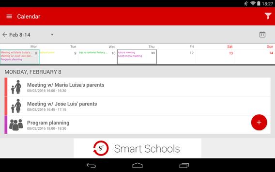 Smart Schools is: SAFE, Smart Schools has high security protocols to ensure the total security of the app, as well as the school’s data; INTUITIVE, Simple and functional, Smart Schools optimizes the user’s experience to meet their needs and to offer high levels of usability to minimize the learning curve; INNOVATIVE, Smart Schools is especially designed for mobile devices and tablets using the latest technology and FUNTIONAL, Smart Schools is a fully functional mobile app, with no conditions or small print, especially designed for schools.