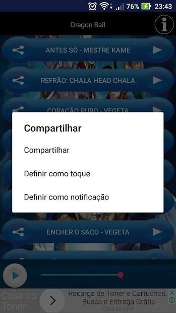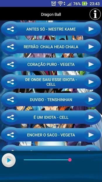 Baixe a botoeira com os sons do anime Dragon Ball. As melhores frases dos melhores personagens, como Son Goku (Kakaroto), Vegeta, Goha, Piccolo, Android 17, Android 18, Cell, Freeza e muito mais. Personagens de Dragon Ball Z, Dragon Ball Super e Dragon Ball GT, além do Dragon Ball Clássico. Instant Button Sons de Dragon Ball.
