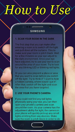 Máy dò camera ẩn là ứng dụng rất hữu ích cho những người muốn riêng tư. Nếu bạn đang ở trong một không gian cá nhân, nơi bạn cảm thấy quyền riêng tư của mình có thể bị xâm phạm với máy dò camera gián điệp khác hoặc bất kỳ camera ẩn nào khác, vì vậy thì ứng dụng của chúng tôi là giải pháp tốt nhất cho vấn đề của bạn với các thiết bị gián điệp như máy dò camera IR. Máy dò camera ẩn này phát hiện các camera vì chúng phát ra bức xạ hồng ngoại. Những bức xạ ánh sáng hồng ngoại này không thể nhìn thấy bằng mắt thường.