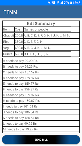 Tu Tera Mai Mera in short TTMM. This app is for outing, eating in different places with different people. This app does the all calculations and saves the data in your device at the same time let you have the choice of sharing that with group members. You have all the flexibility to choose who ate what and share that food accordingly.