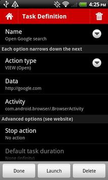 Task Bomb is an automation app (sometimes called "task scheduler", "job scheduler", "batch processor", etc.) that allows you to schedule apps and actions to automatically run. It's similar in function to the cron command on Linux and somewhat like an alarm clock (you can set alarms and snooze actions). TaskBomb aims to be small and simple, and leverage the power of the apps you have on your phone.