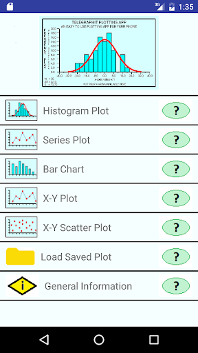 A small and simple graphing application for Android phones with five types of graphs or plots: Histogram, Series, Bar Chart, X-Y Plot, and X-Y Scatter Plot.