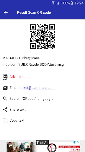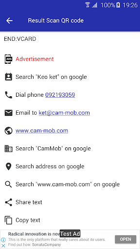 QR code or Barcode on item, product, name card or other product. The information of QR code can be TEXT, PHONE NUMBER, MESSAGE, EMAIL, NAME CARD. The result of scanning code we can "Search with Google by name company organization address website, Copy text, Share Text, Dial phone call, Send the Message, Send the Email, Browse website...