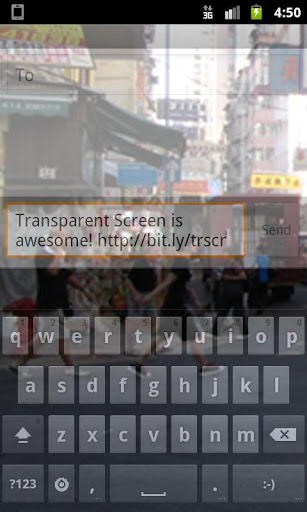 The best free transparent screen app start the app and it instantly makes your screen transparent. Have you ever typed or read on your smartphone while walking at the same time? If you too like to walk and read or walk and text, Transparent Screen is just made for you.Transparent Screen enables you to see through the screen with a little camera trick without forcing you switching to another SMS app or Email app. It just makes you entire screen transparent, and you can use your phone as usual. Again its not just SMS, you can also browse the Internet or check for the latest news while on the go. Transparent is carefully designed with polished UI, which suits your stylish Android phone. Be ready to impress your friends and family with Transparent ScreenTransparent Screen is FREE Just give it a try. An adfree Pro version with many advanced features is also available on Android Market.