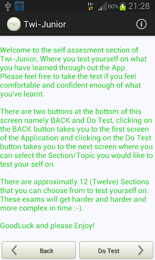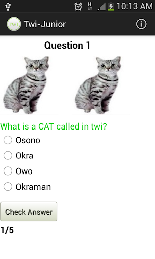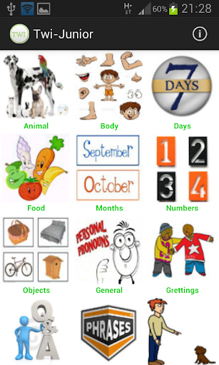 Twi-Junior is designed for people who want to learn (Twi) or parents who want to teach their children (Twi). This application so far gives both images and pronunciations of items. As this applications matures so will its contents. A Youtube Channel has now been launched to help with the lessons, please click on the link to navigate to our channel https://www.youtube.com/watch?v=rnTn6GX08k4