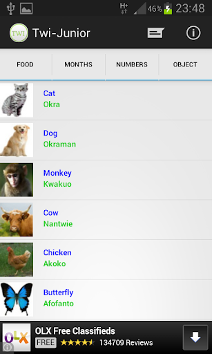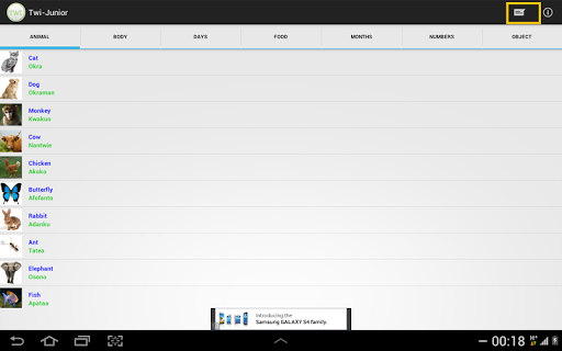 Note: The application has Nine (9) Tabs on the landing page: Animal, Body, Days, SoulNames,Food, Months, Numbers, Object and Colours. These tabs appear perfectly on a 10.1inch Tablet but on normal phones and 7inch Tablets you will need to scroll the tabs to the left to see the rest of the options.