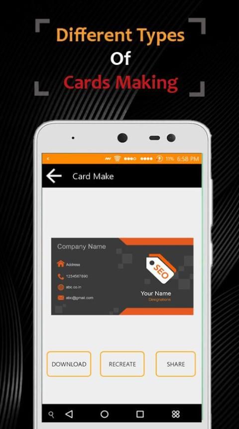 This is a Free Visiting Card Making or Generating Application. We have all kinds of Business Card Templates available to customize online. You can create any business card depending upon your business online by selecting any one card template, fill all the details required for personalize your visiting card and then follow the procedure and within few seconds your personal visiting card is ready to download in your mobile phone for free. We offer many category wise cards and will be updated regularly for giving the huge options to our valued app users.