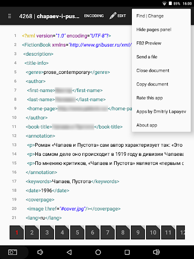 Ứng dụng được thiết kế để xem và chỉnh sửa .xml, .html và các tệp văn bản khác.Đã thực hiện cơ hội chỉnh sửa theo hai cách: theo các hàng và trang từng trang.