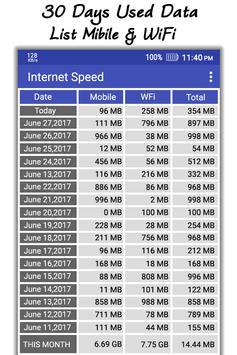 Internet speed Tester application stores daily mobile internet usage and daily wifi internet usage in sql datas and user can see internet traffic usage of last 30 days which are represented in internet usage charts and internet usage rows. Both wifi and mobile network traffic usages are represented in seperate activities and each of them has 3 subsections (mobile download, mobile upload and mobile total traffic usage for mobile traffic usage and wifi download, wifi upload and wifi total traffic usage for wifi data usage).