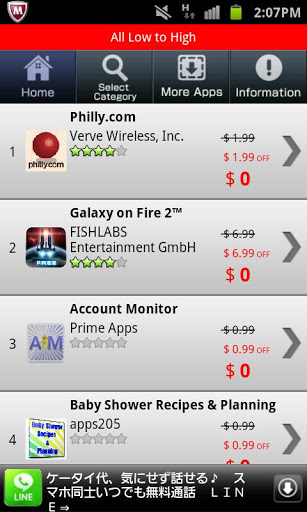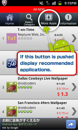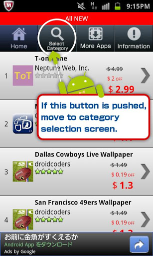 Provides daily information on discounted, paid applications available through the android Market.Not only does it pull in comprehensive Android Market sales information, but also provides data on a per category basis.Making the search for any single discounted application a convenience.Additionally, search information can be variously sorted allowing one to rank an application on a number of pricebased criteria: Sort by Menu: New arrivals. Highest discount. Lowest price. Highest price.Sales information is updated daily. check back often to benefit from bounteous discounts How to perform a category search:In order to select a specific category, tap quot;Select Categoryquot; from the Menu Bar. How to sort categories:Once a category has been selected, press your phone39;s quot;Menuquot; button. Sort criteria will subsequently be displayed.