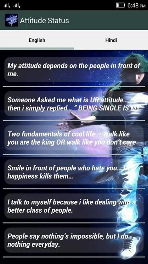 Attitude Status app is a great status application having various categories like Hindi,English and Other.