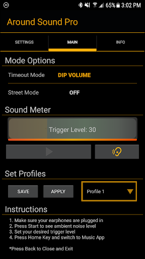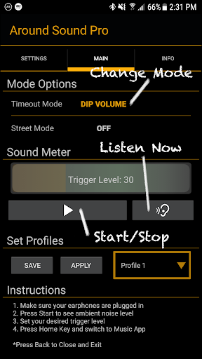 Đảm bảo tai nghe của bạn được cắm vào. Chỉ cần khởi động ứng dụng, bắt đầu đẩy, xem mức nhiễu xung quanh bạn, đặt mức kích hoạt bằng cách sử dụng ngón tay để vuốt đồng hồ, nhấn nút home để truy cập âm nhạc, video hoặc trò chơi của bạn và thưởng thức.