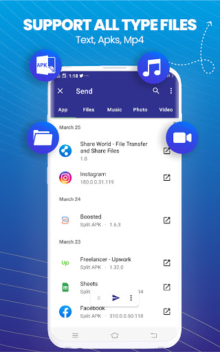 Chia sẻ Tệp chia sẻ và chia sẻ tệp thế giới là một ứng dụng hỗ trợ truyền dữ liệu sau khi gọi từ điện thoại này sang điện thoại khác mà không cần máy tính.Các chức năng hữu ích bao gồm ảnh truyền đơn giản, video, tài liệu tệp, dễ sử dụng tệp người gửi một lần nhấp hoặc tệp nhận khi nó quan trọng nhất.
