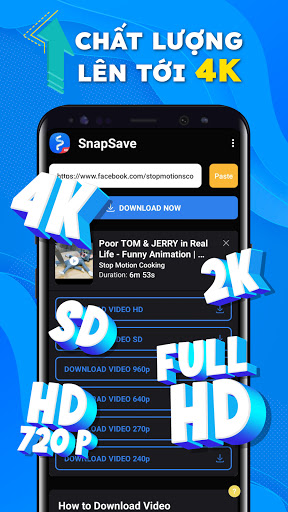 Bạn có thể chọn độ phân giải, kích thước và định dạng video khác nhau để lưu video trên facebook hd, tải xuống trong nền với tốc độ nhanh. Trình quản lý tệp tích hợp lưu các video đã tải xuống và bạn có thể xem chúng ngoại tuyến mọi lúc mọi nơi. Bạn có thể dễ dàng tải video Facebook về thiết bị Android của mình. Bằng cách này, bạn có thể thưởng thức các video đã tải xuống mọi lúc, mọi nơi hoặc chia sẻ chúng với những người khác thông qua ứng dụng tải video 4k về điện thoại. Bạn có thể tải về facebook để giao lưu với bạn bè và tải video từ facebook về điện thoại. Đặc biệt với ứng dụng SnapSave bạn còn có thể tải chương trình tivi, phim ảnh , stream game... mà được người dùng đăng tải lên Facebook Watch.