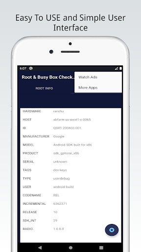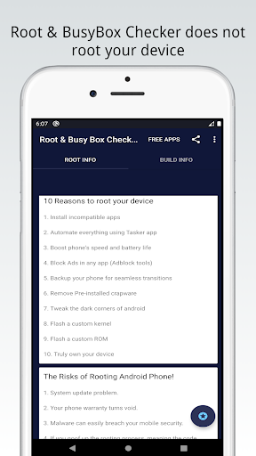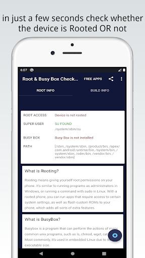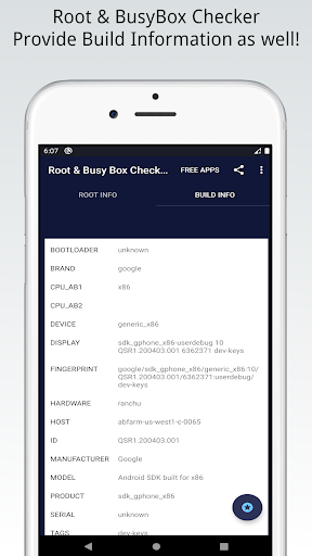 Root & BusyBox Checker không root thiết bị của bạn và không sửa đổi bất kỳ tệp hệ thống nào . Mục đích chính của ứng dụng là để kiểm tra thiết bị được root (có quyền truy cập root) hay không. Nó cũng cung cấp thông tin hữu ích về việc root. Ứng dụng trình kiểm tra root & busybox này ứng dụng Android cũng hiển thị lịch sử xây dựng điện thoại Android của bạn AKA Thông tin xây dựng điện thoại Android của bạn và loại thông tin khác liên quan đến điện thoại Android của bạn.