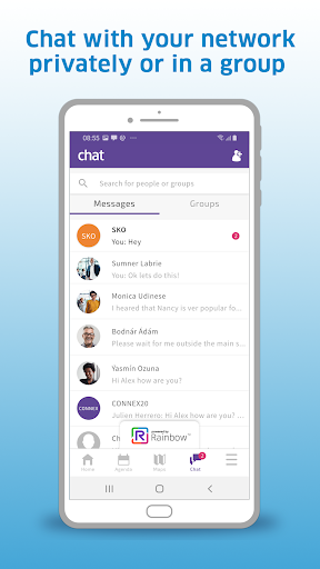 Thảo luận với các người tham dự khác, các nhà tài trợ, loa của IM, âm thanh hoặc cuộc gọi video. Bạn cũng có thể chia sẻ hình ảnh và tài liệu trong một cuộc trò chuyện riêng tư hoặc nhóm để giảm chất thải giấy nhờ tích hợp RainbowTM của chúng tôi.