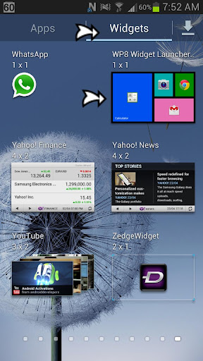 Nhấn và giữ lâu trên màn hình chính của bạn cho đến khi menu xuất hiện. Ngoài ra, bạn có thể nhấn nút "Menu" và sau đó nhấn nút "Thêm ứng dụng và widget" sẽ có sẵn trên màn hình. Cả hai phương pháp nên đã dẫn đến một menu menu bật lên. Nhấn vào mục menu có nhãn "Widgets" trên đầu trang. Điều hướng đến WP8 Widget Launcher Windows 8 và chọn nó