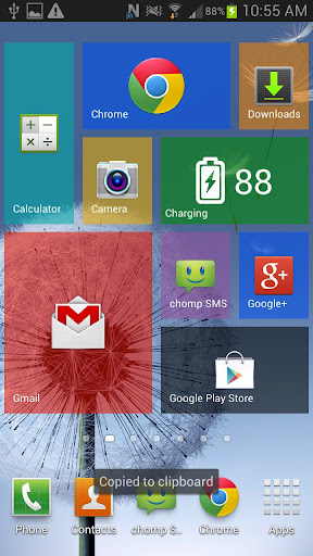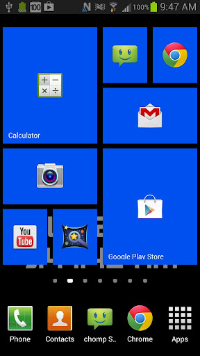 Luôn muốn có Windows 8 xem trên thiết bị Android của bạn? Chờ đợi gì nữa, Trình khởi chạy WP8 Widget biến màn hình Android của bạn thành một trải nghiệm Windows 8 đẹp! Chỉ cần chọn một màu và một ứng dụng và bạn đã đặt! Cũng có thể được sử dụng trên màn hình khóa của bạn! Bạn có thể thêm các ô bằng các ứng dụng yêu thích của mình trên màn hình chính dựa trên các ứng dụng đã cài đặt của bạn như trình duyệt, điện thoại, thư và nhắn tin. Không cần phải root thiết bị của bạn hoặc cài đặt các ứng dụng hoặc chủ đề của bên thứ ba. Trình khởi chạy WP8 Widget này làm điều đó tốt nhất!