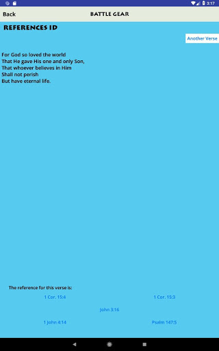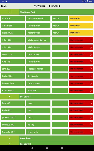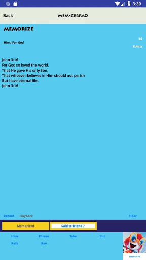 Phụ huynh và trẻ em sẽ thích ghi nhớ những câu thơ trong ứng dụng bộ nhớ kinh thánh này phối hợp với chương trình WingRunner tia lửa Awana. Bao gồm tất cả các bài hát Awana. Trẻ em thích khả năng ghi âm. Trẻ em có thể nhìn thấy, nghe, ghi lại, hát và nói câu thơ và chơi một số hoạt động khác nhau để giúp họ kết hợp những câu thơ về bộ nhớ. Theo dõi bộ nhớ và trạng thái đánh giá cho nhiều người tham gia và đưa ra điểm cho hoạt động bộ nhớ / đánh giá của họ. Như phần thưởng, những người tham gia chọn động vật để "giúp Nô-ê tải Ark" và nghe thấy âm thanh động vật.