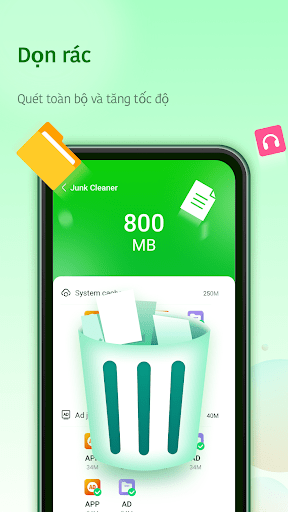 Dọn dẹp rác: dọn rác trong bộ nhớ điện thoại của bạn, chạy trình dọn dẹp chuyên sâu, giải phóng RAM, tối ưu hóa việc sử dụng RAM