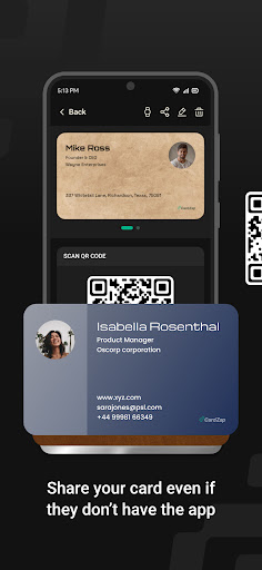 Bạn cũng có thể chia sẻ thẻ vớiMã QR có thương hiệu, Imessage, thông qua Apple Watch, trên phương tiện truyền thông xã hội, thông qua AirDrop, NFC, v.v.Điều này có nghĩa là khi bạn quét bất kỳ danh thiếp kỹ thuật số hoặc danh thiếp vật lý trong CardZap, nó sẽ lưu trữ ngày & amp;nơi bạn gặp họ.Vì vậy, ngay cả khi bạn quên tên của người đó, bạn có thể tìm thấy chúng nếu bạn biết ngày hoặc địa điểm mà bạn gặp họ.