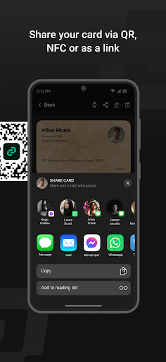 Bạn có thể chia sẻ danh thiếp kỹ thuật số của mình thông qua các văn bản và email được cá nhân hóa, chia sẻ URL của thẻ hoặc quét mã QR của danh thiếp ảo.