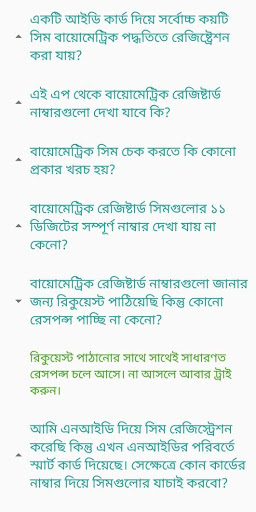 Đây là một ứng dụng đơn giản sẽ giúp bạn biết có bao nhiêu thẻ SIM được đăng ký với NID của bạn.Điều này cũng sẽ giúp bạn với một số câu hỏi chung về đăng ký sinh trắc học. Thưởng thức ứng dụng!