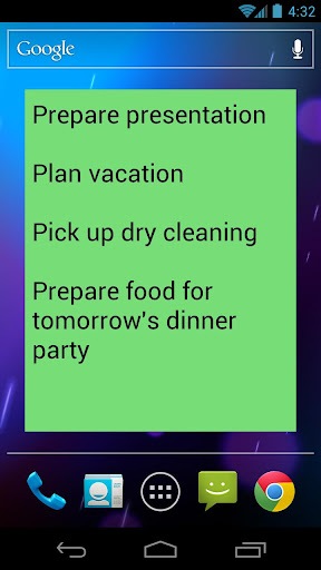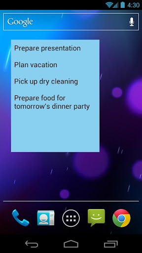 Một widget ghi chú dính nhẹ, không vô nghĩa!Có thể thay đổi kích thước, có thể cuộn và bật cho cả màn hình chính của bạn và (trên các thiết bị chạy Jelly Bean và Kitkat) màn hình khóa.Không có quyền cần thiết!Phiên bản Plus cho phép bạn chọn màu nền, kích thước phông chữ và chia sẻ văn bản ghi chú vào các ứng dụng khác.