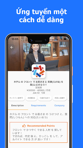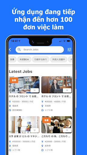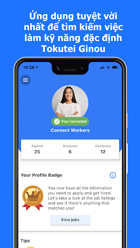 Connect Job WORKERS là ứng dụng tìm việc làm tuyệt vời cho người nước ngoài đang muốn tìm kiếm việc làm kỹ năng đặc định Tokutei Ginou ở 14 ngành nghề. Bạn sẽ được ứng dụng kết nối với các công ty Nhật đang tuyển dụng các vị trí toàn thời gian cùng mức lương, chế độ hấp dẫn. Ứng dụng này hoàn toàn miễn phí và cực kì dễ sử dụng cho các ứng viên người nước ngoài.