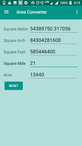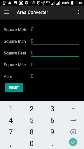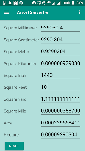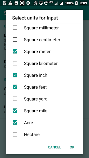 Các đơn vị bao gồm là: SQ MM, SQ CM, SQ M, SQ KM, SQ Inch, Sq feet, SQ YARD, SQ Mile, Acre, Hectare.