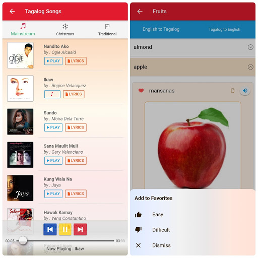 🎶 Built-in Music Player which includes Tagalog Songs, lyrics with English Translations.