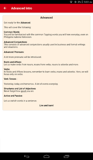 Learn how to construct basic and advanced Tagalog sentences by familiarizing Tagalog affixes, nouns, verbs, adverbs, and adjectives and more. Learn Tagalog grammar in order for you to create sentences on your own. The structure of this app is teach you some Tagalog words first before greetings then diving into grammar.
