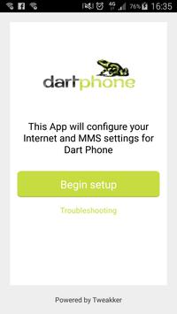 The Dart Phone APN Setup App can be used by Dart Phone customers to configure their APN settings to access Internet and picture messaging (MMS) on the Dart Phone network. Simply install the application, press "Begin Setup" and follow the instructions.